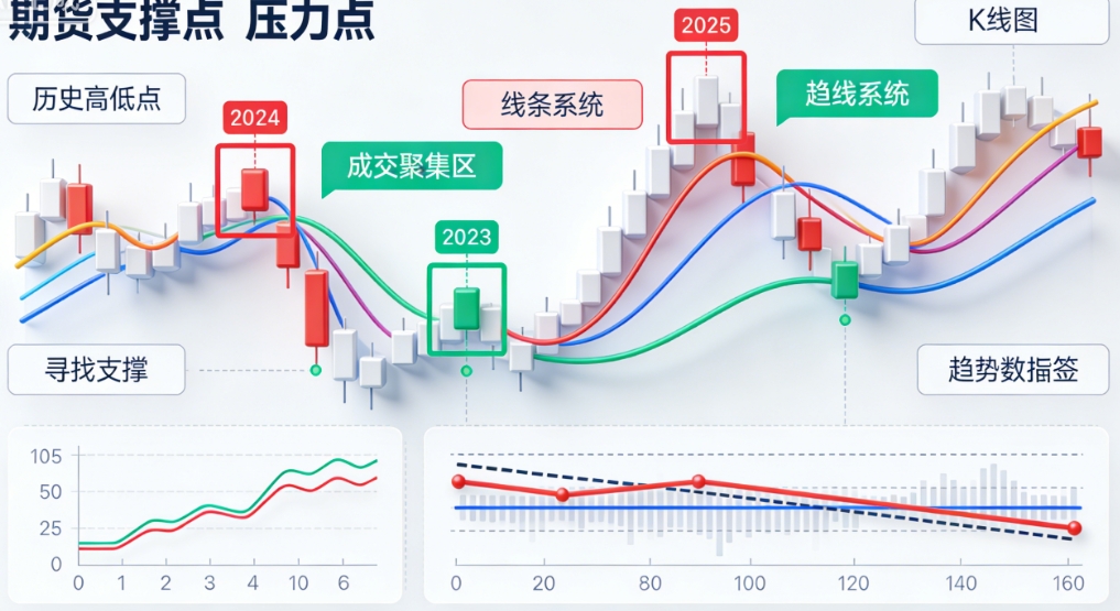 复盘目标期货品种近3-6个月的K线图,重点标记多次触及但未突破/跌破的关键价位:价格多次下跌至某一低点后反弹,该点位即形成**强支撑**;多次冲高至某一高点后回落,该点位则构成**强压力**。实操中,优先关注近10-20个交易日的高低点(短期点位)和3-6个月的关键价位(长期点位),短期点位适配日内交易,长期点位适合波段操作。