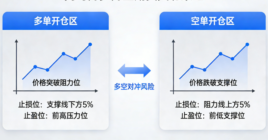 双开仓位布局:同时开仓多单和空单,仓位比例1:1,总仓位控制在20%-30%,多单止损设置在震荡区间下沿下方,空单止损设置在震荡区间上沿上方,止损幅度控制在总资金的1%-2%;